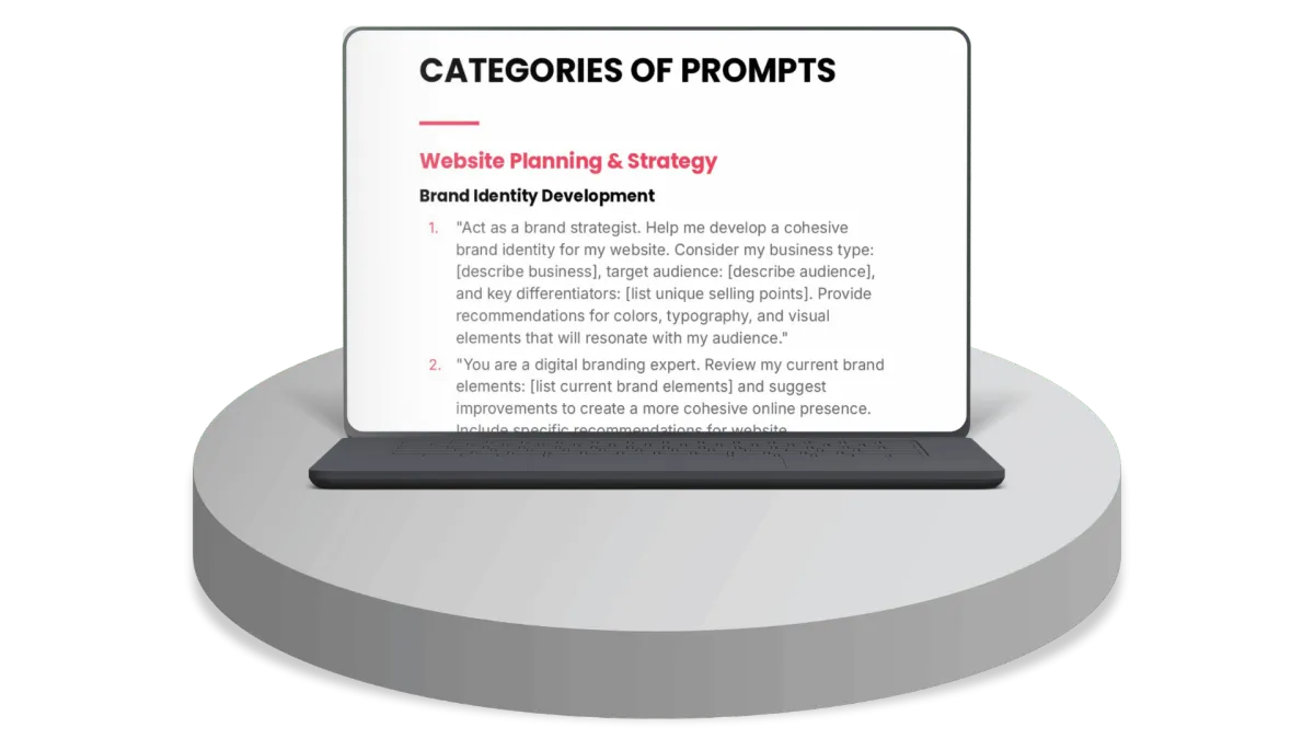 Get expert guidance whenever you need it with our comprehensive AI prompts guide. Never get stuck on website content or design - you'll have perfectly crafted prompts to help generate compelling copy, create stunning visuals, and optimize your site's performance at every stage of the building process.